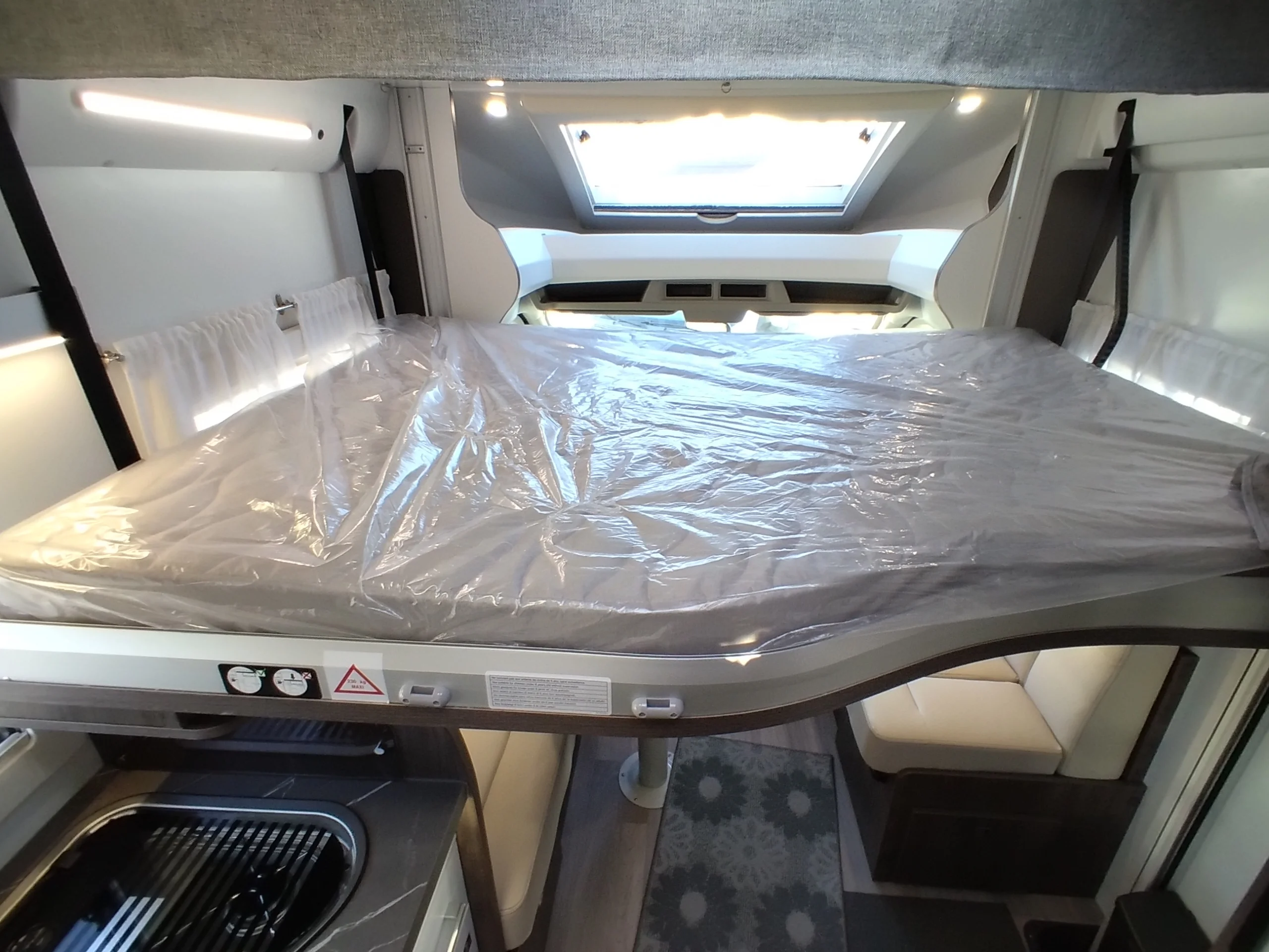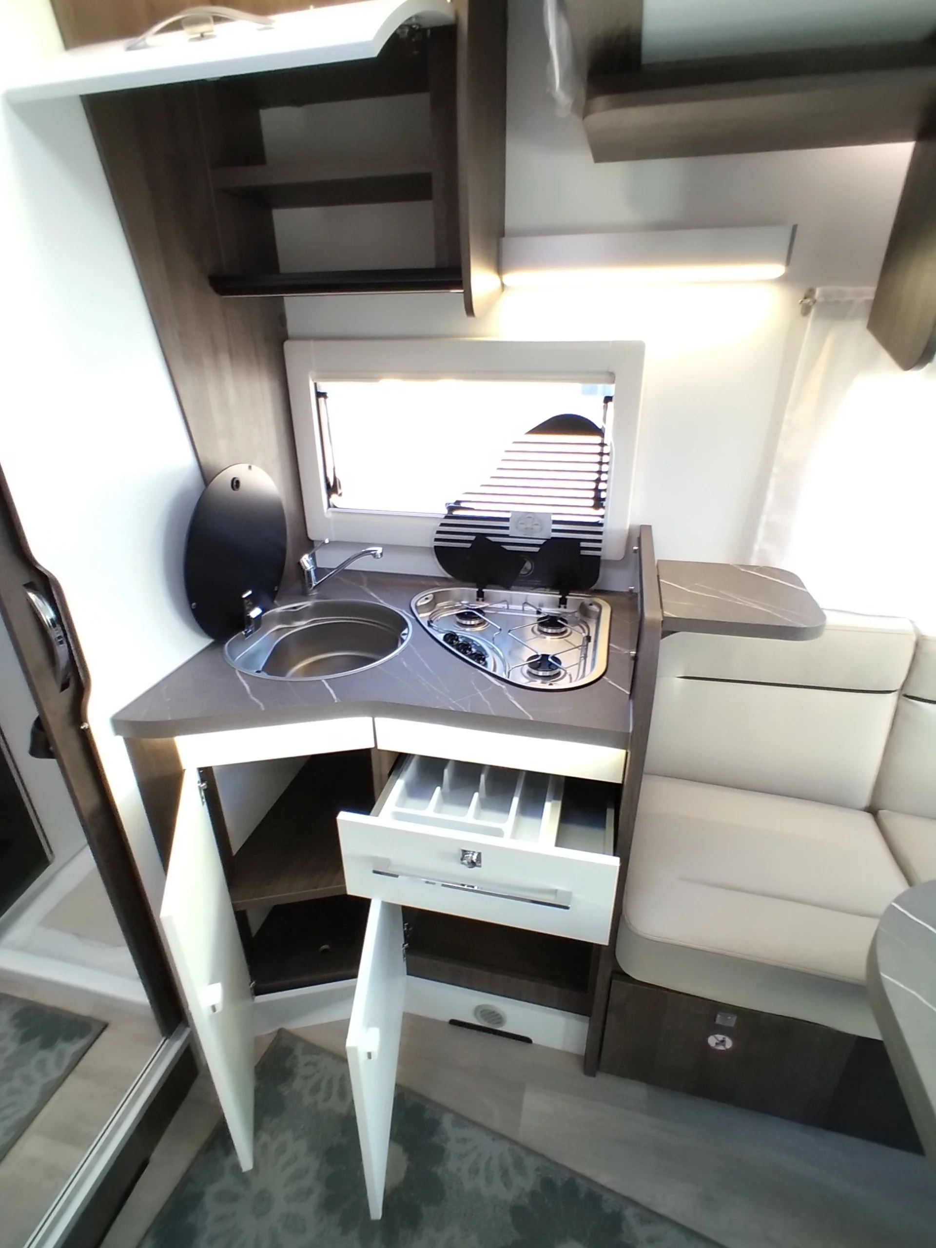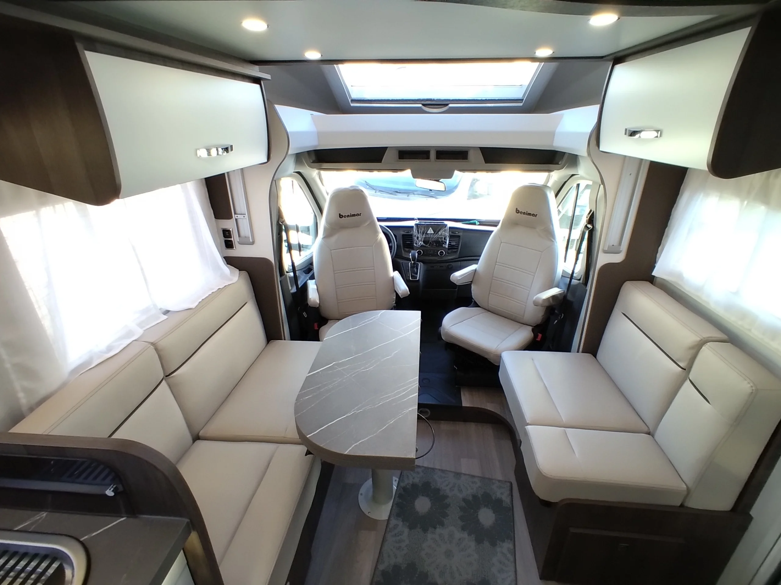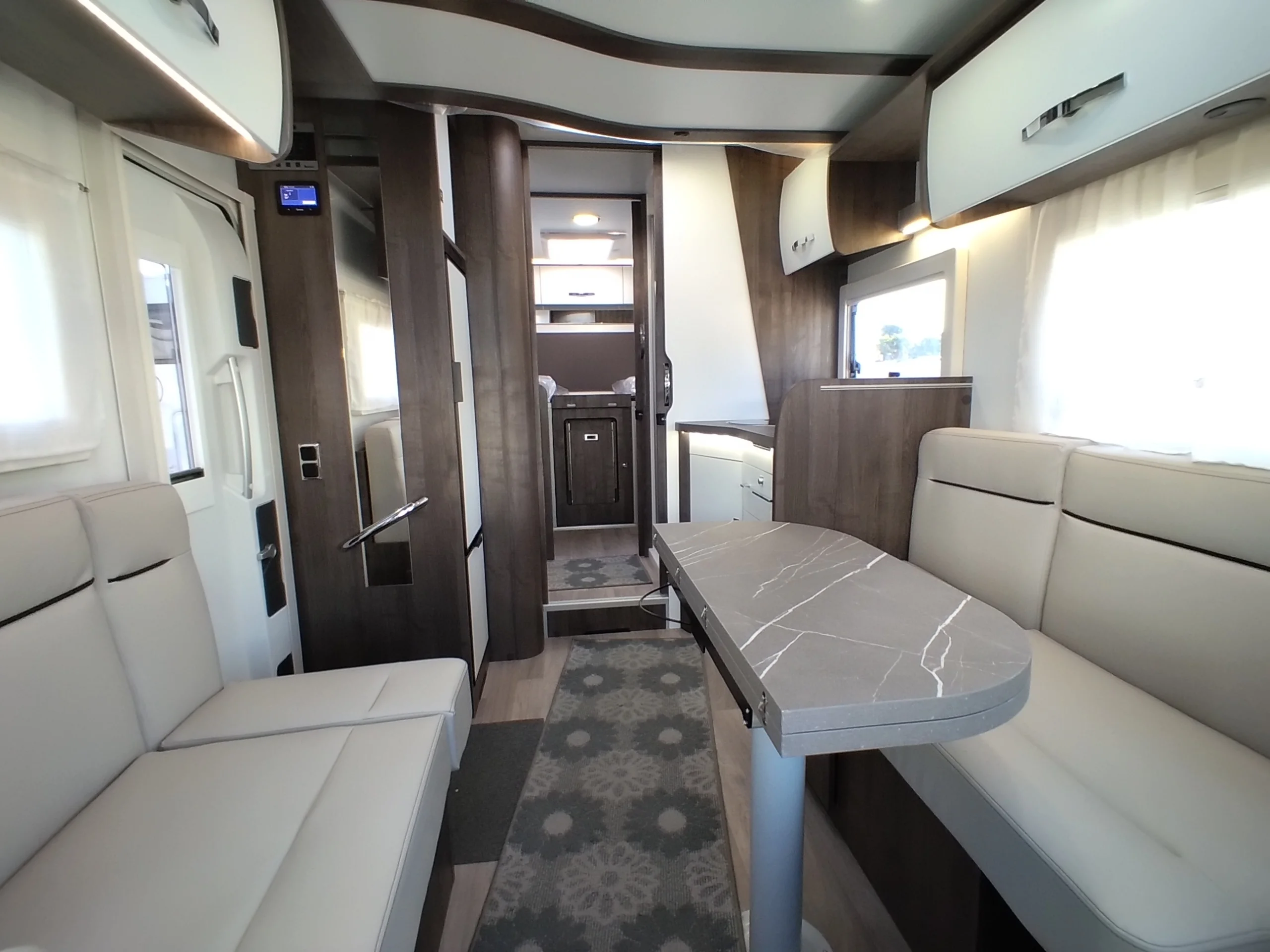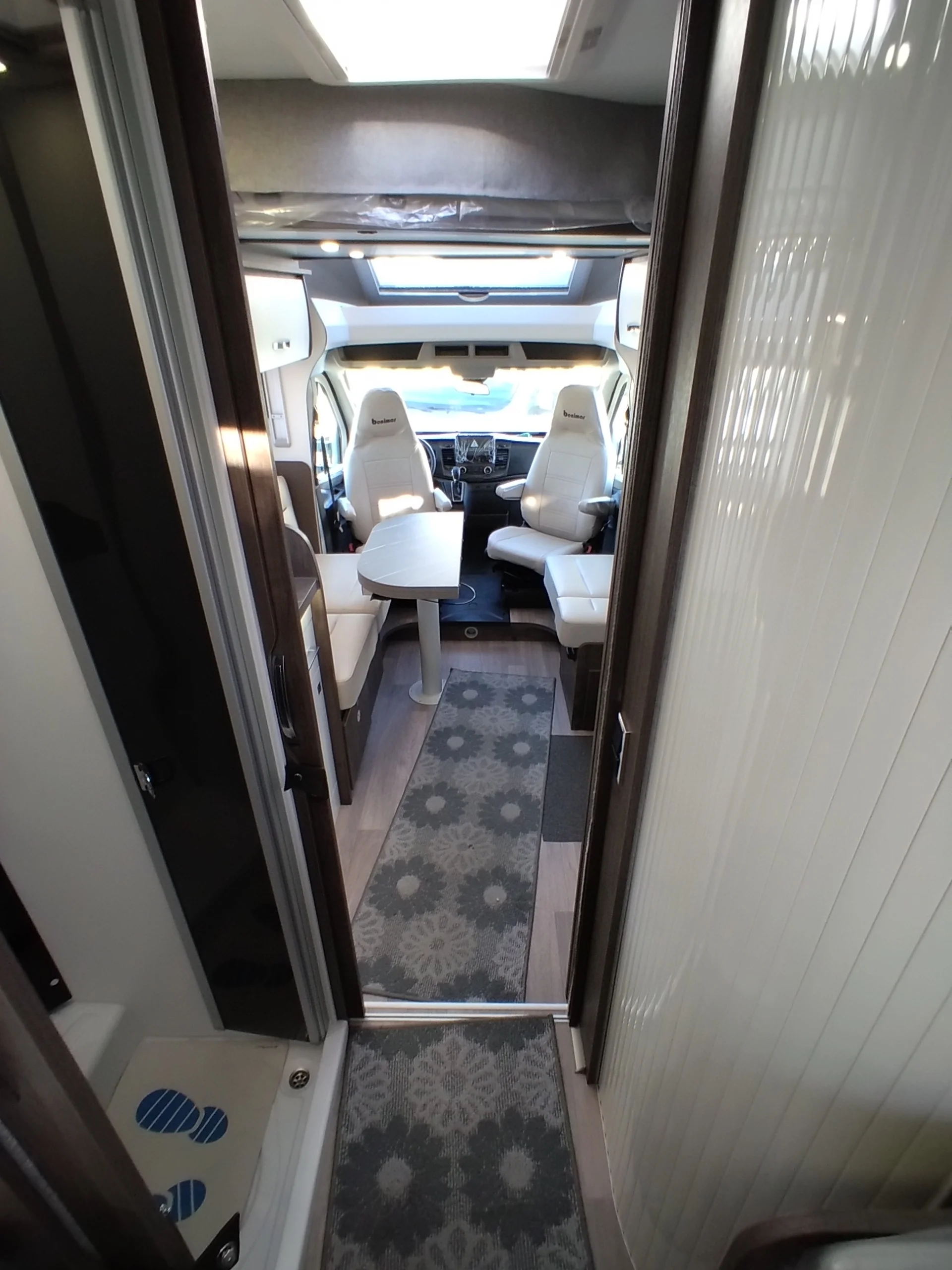 Uvnitř najdete prakticky řešený interiér s důrazem na pohodlí během jízdy i při kempování. Otočná přední sedadla, prostorný obývací prostor a chytré úložné prostory zajišťují maximální komfort na každé cestě.
