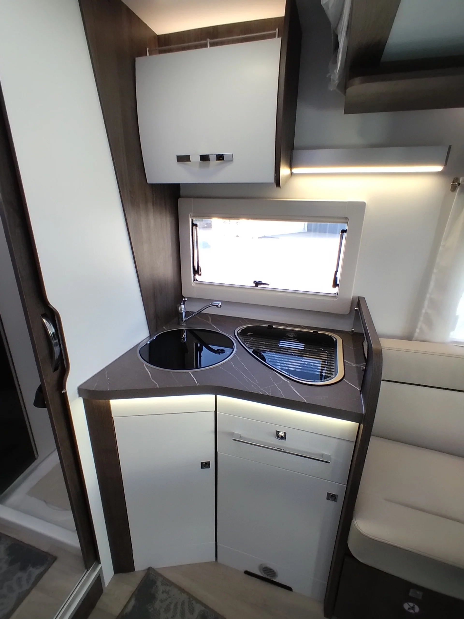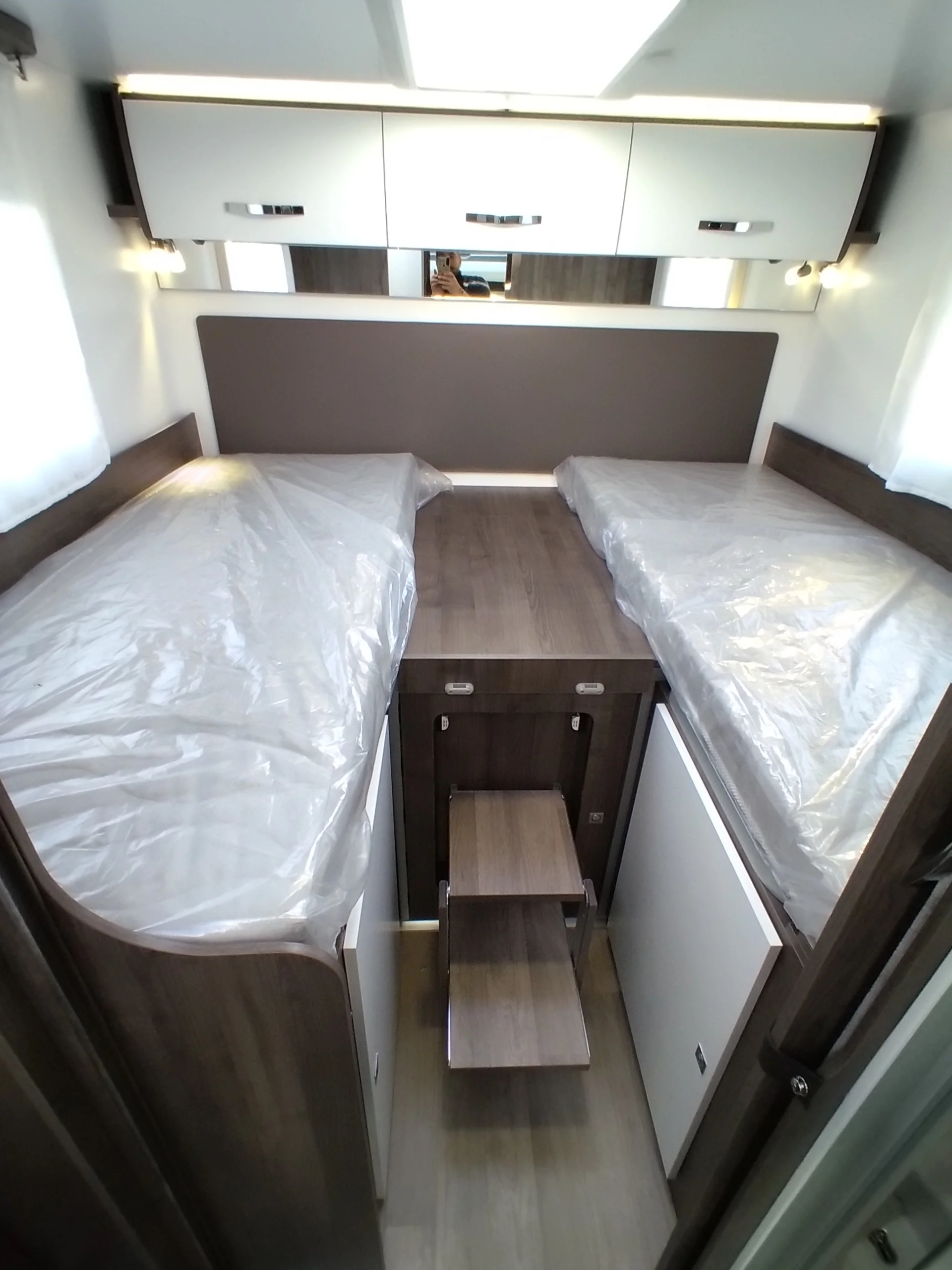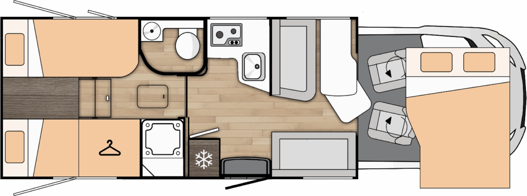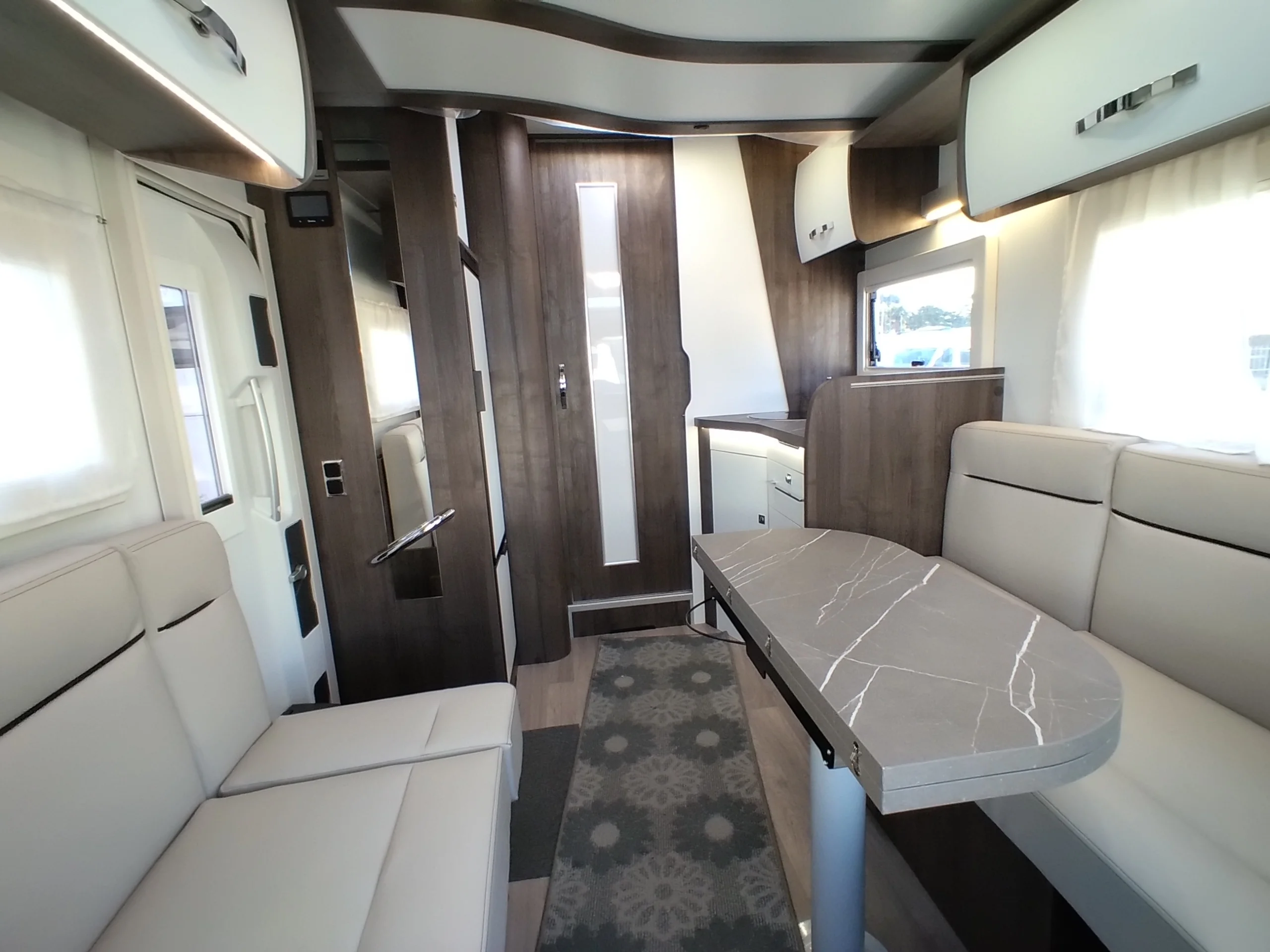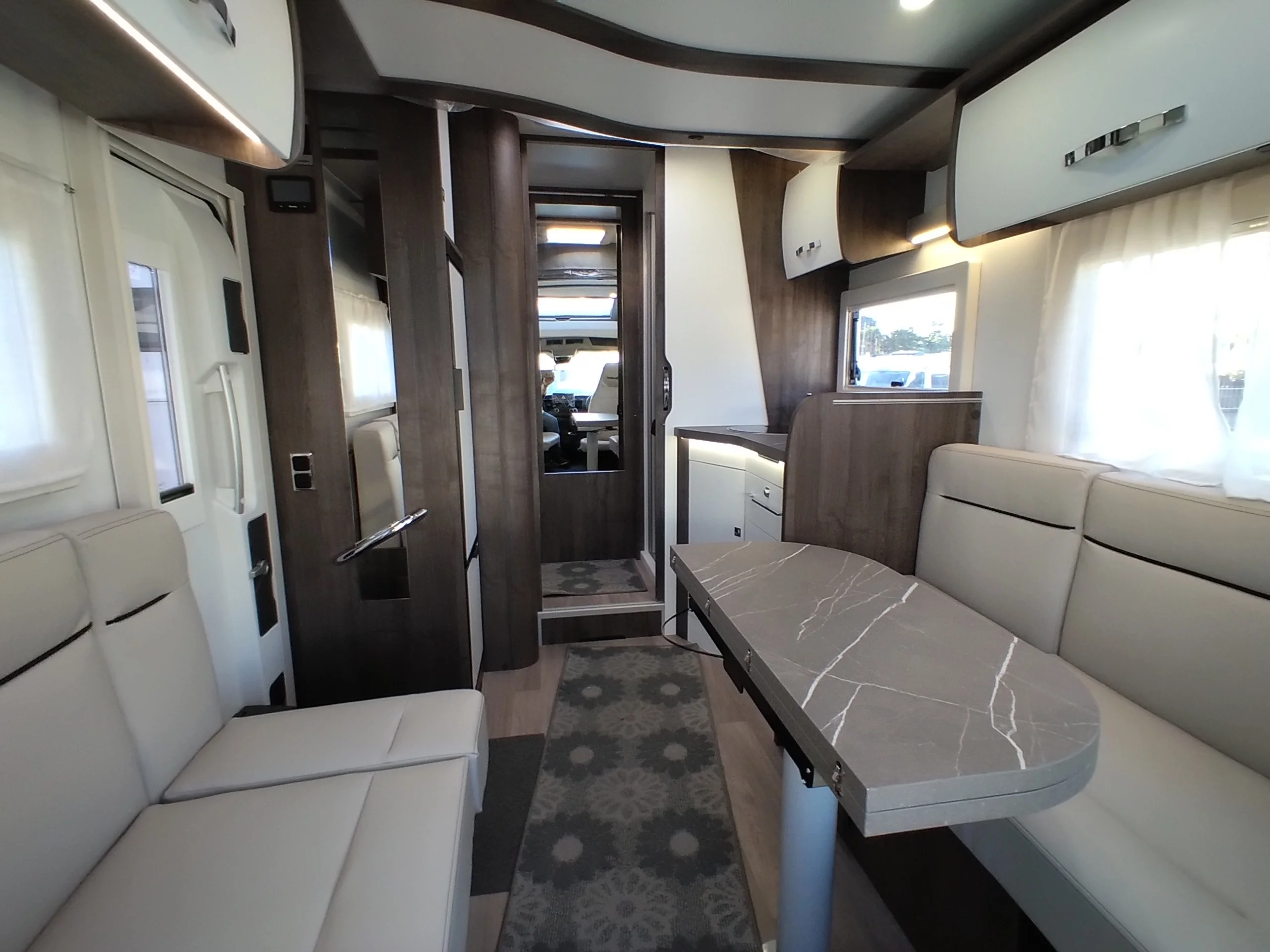 Uvnitř najdete prakticky řešený interiér s důrazem na pohodlí během jízdy i při kempování. Otočná přední sedadla, prostorný obývací prostor a chytré úložné prostory zajišťují maximální komfort na každé cestě.